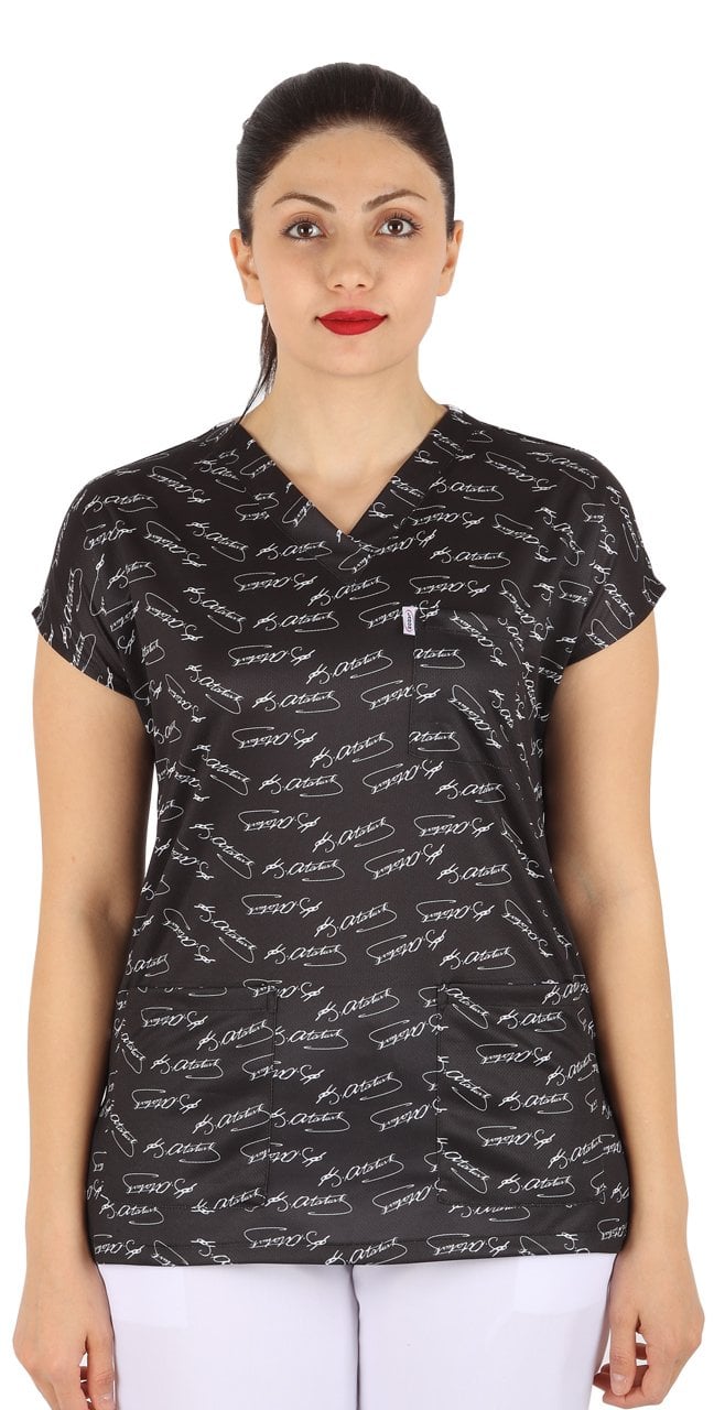 Atatürk İmzalı Desenli Bayan Cerrahi Forma Üst, hem şıklığı hem de milli birliği simgeleyen özel bir üründür. Sağlık çalışanları için hem işlevsel hem de estetik bir seçenektir.
