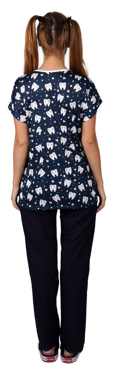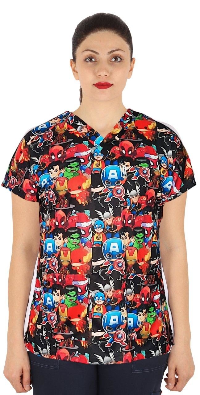Cerrahi desenli kadın tek üst süper kahramanlar desenimizi istediğiniz renk pantolon ile tamamlayabilirsiniz.