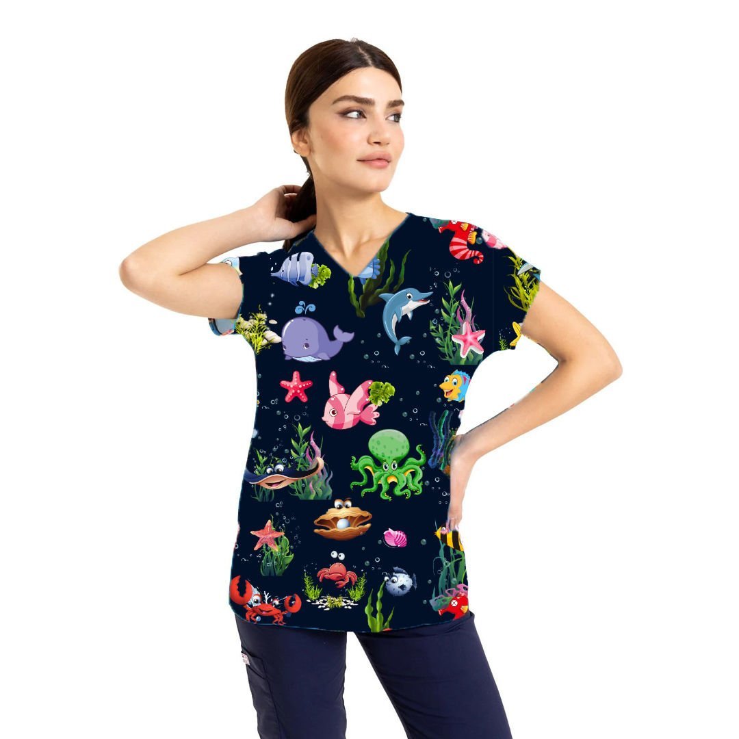 Denizler alemi desenli cerrahi kıyafet ise, özellikle cerrahların giydiği bir tür scrubs cerrahi kıyafettir. Bu kıyafet, deniz canlıları, deniz yosunu, mercan resimleri gibi deniz temasına uygun desenlerle tasarlanmıştır. Bu tarz cerrahi kıyafetler, özellikle deniz biyolojisi, sualtı cerrahisi gibi alanlarda çalışan cerrahlar tarafından tercih edilebilir.