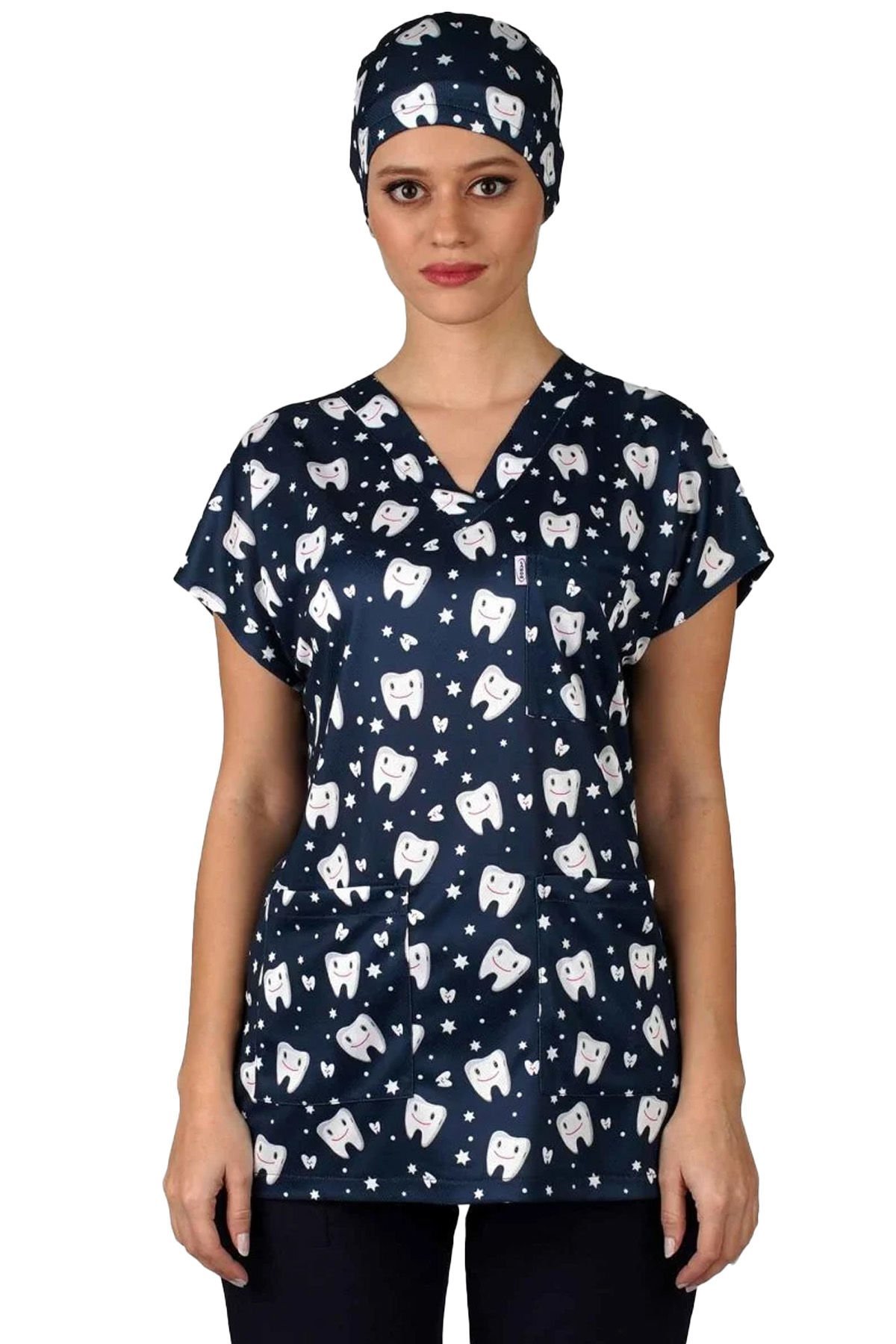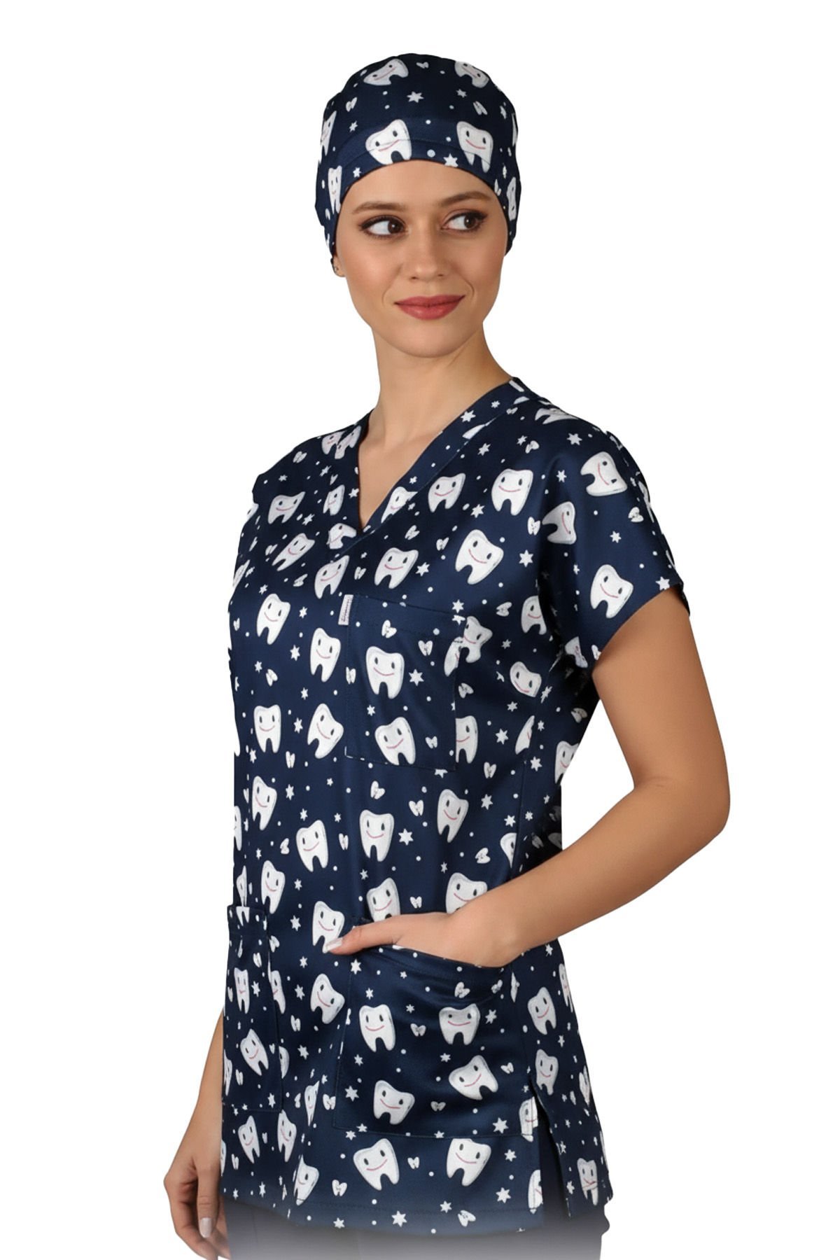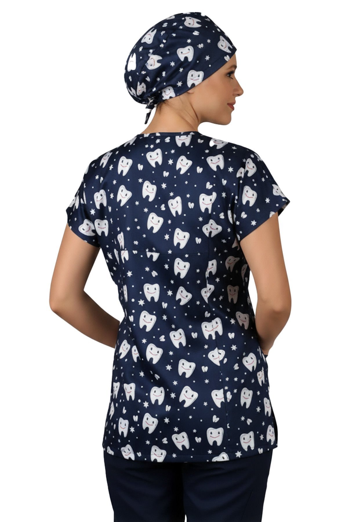 Cerrahi Forma Üst Lacivert Diş Desenli İnce Kumaş-Kadın