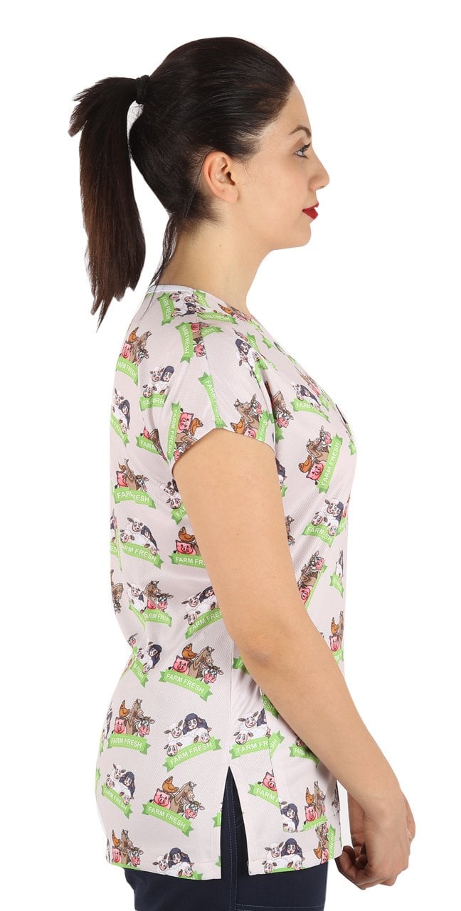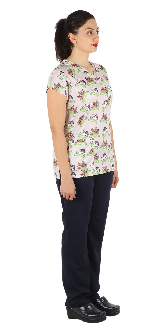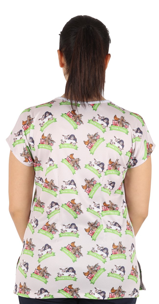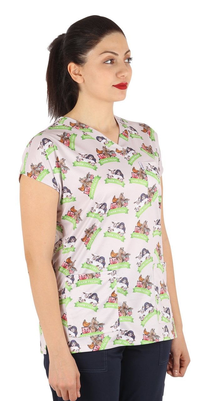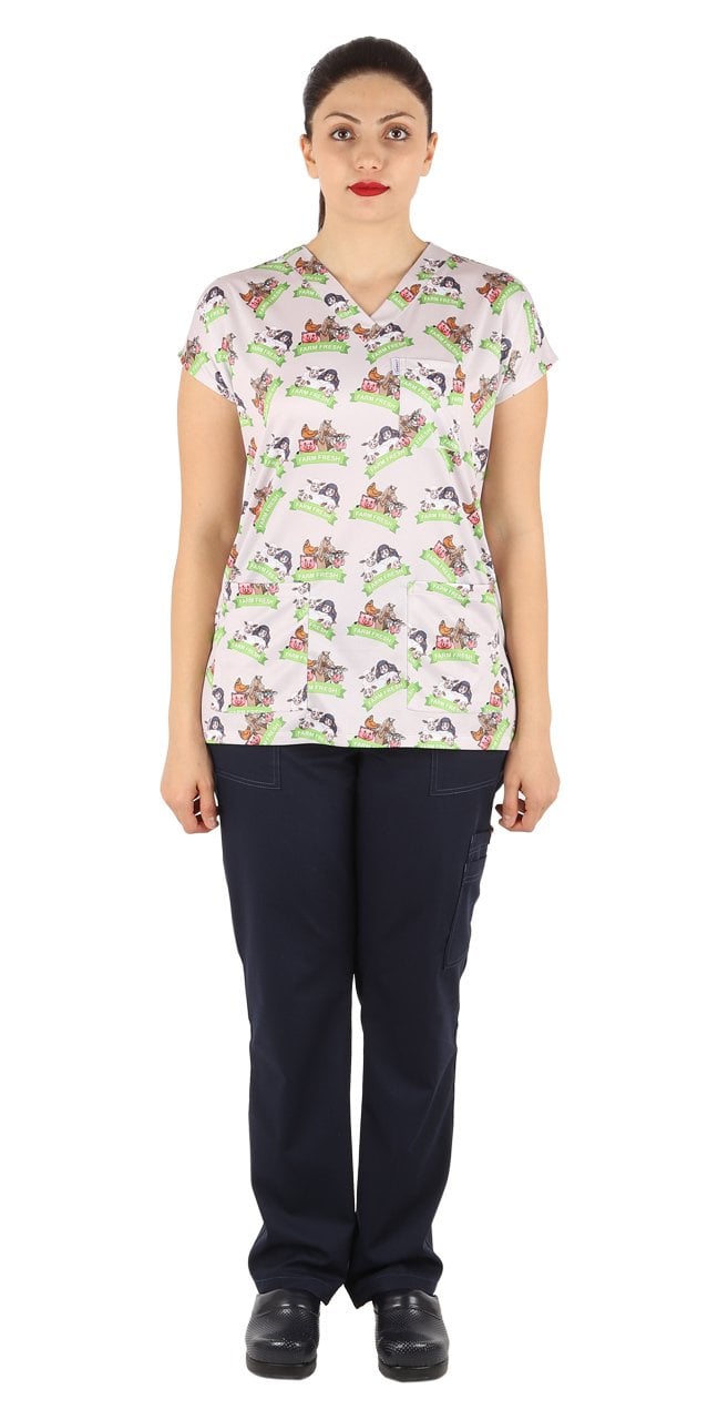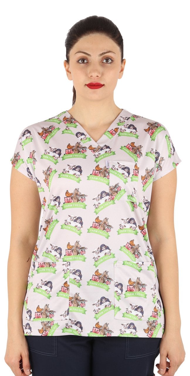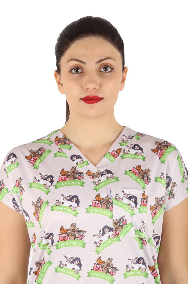 Sağlık sektöründe çalışan kadınların günlük hayatlarına renk katmak isteyenler için tasarladığımız Desenli Tek Üst Bayan Model 34 Cerrahi Forma Üstü, sevimli çiftlik hayvanları desenleriyle dikkat çekiyor.