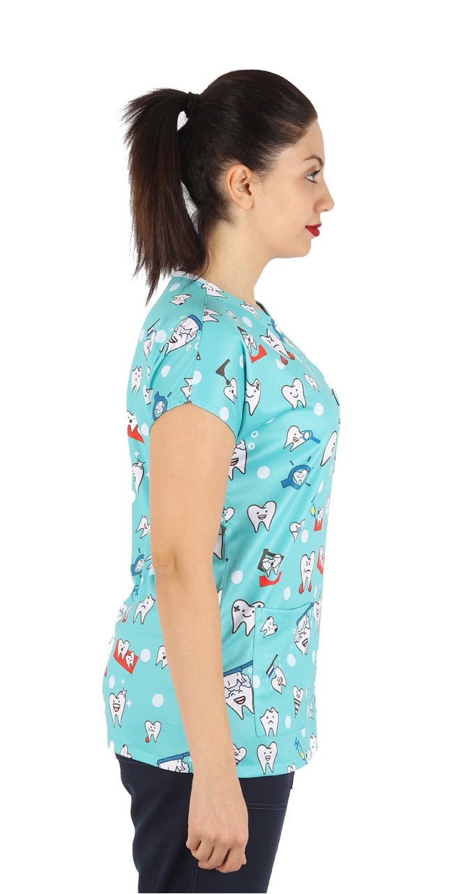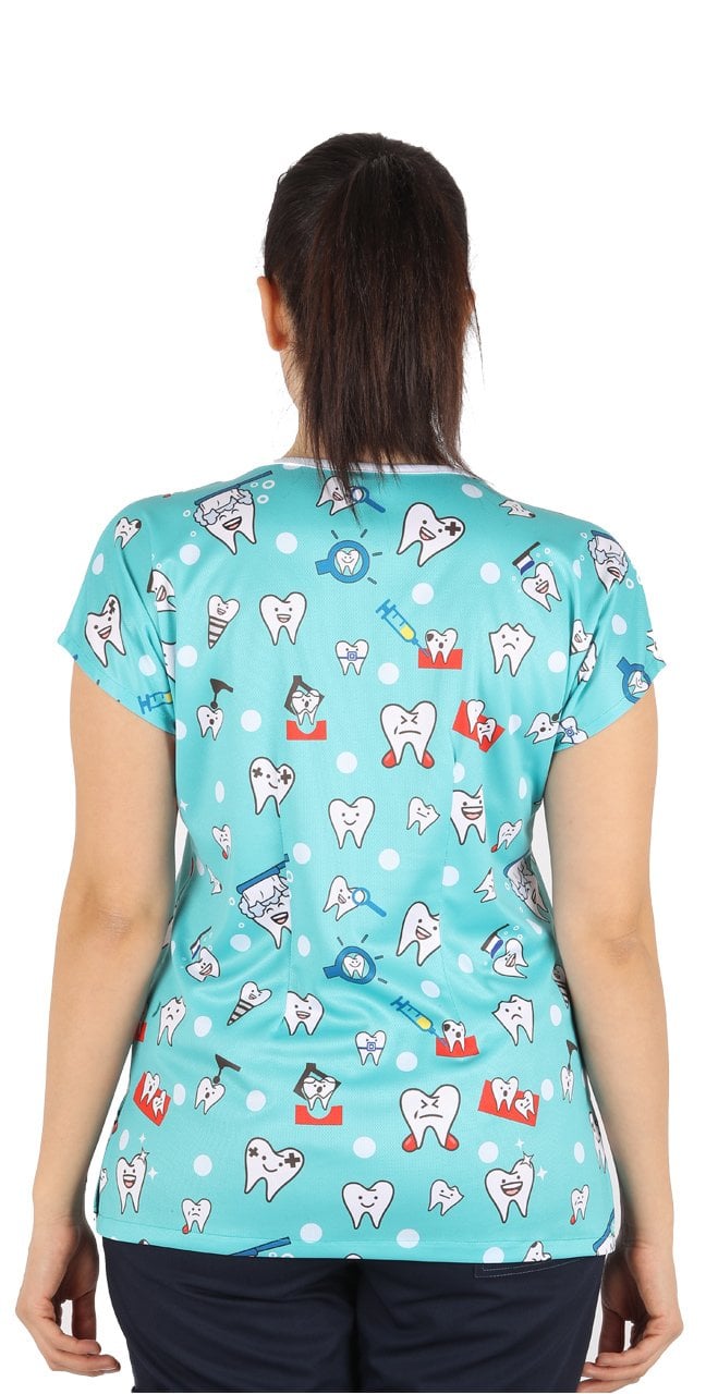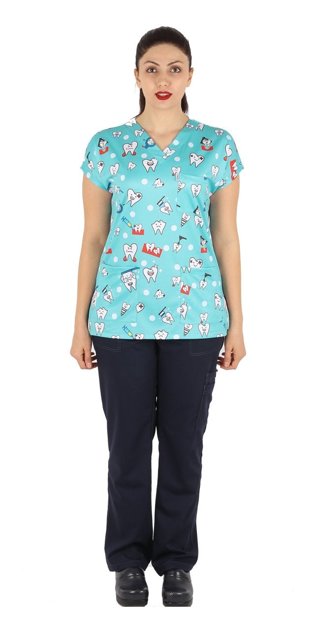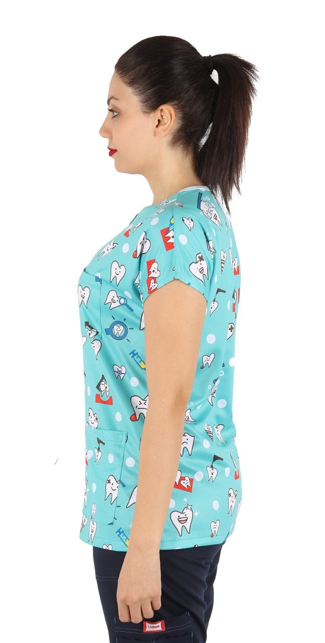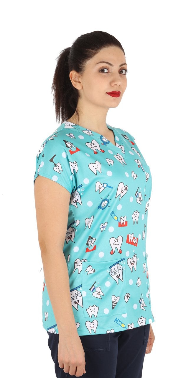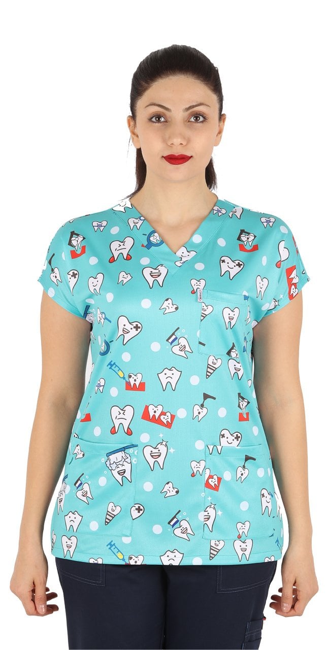 Diş Desenli Bayan Cerrahi Forma Üst Yeşil Renk İnce Kumaş