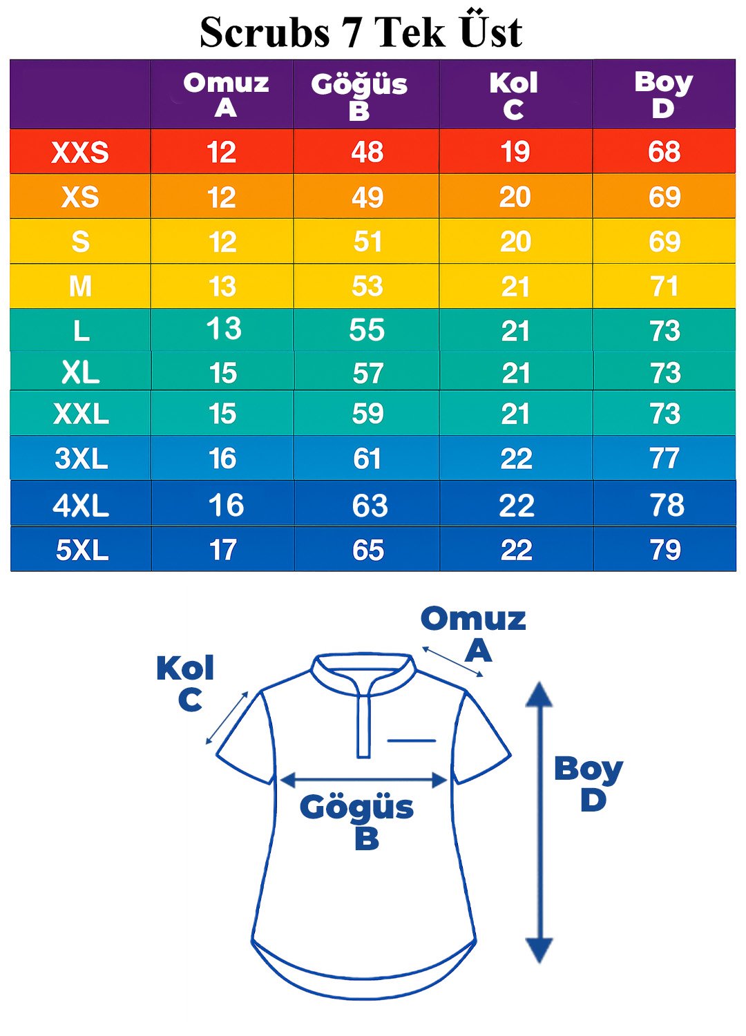 Scrubs 7 Model, Tek Üst Likralı Pamuklu Unisex, günlük hayatınızda ve iş hayatınızda size üstün konfor ve hareket özgürlüğü sunmak için tasarlanmış özel bir üründür. Yumuşak ve nefes alabilen likralı pamuklu kumaşıyla cildinize nazikçe dokunurken, esnek yapısıyla her hareketinizi takip eder.