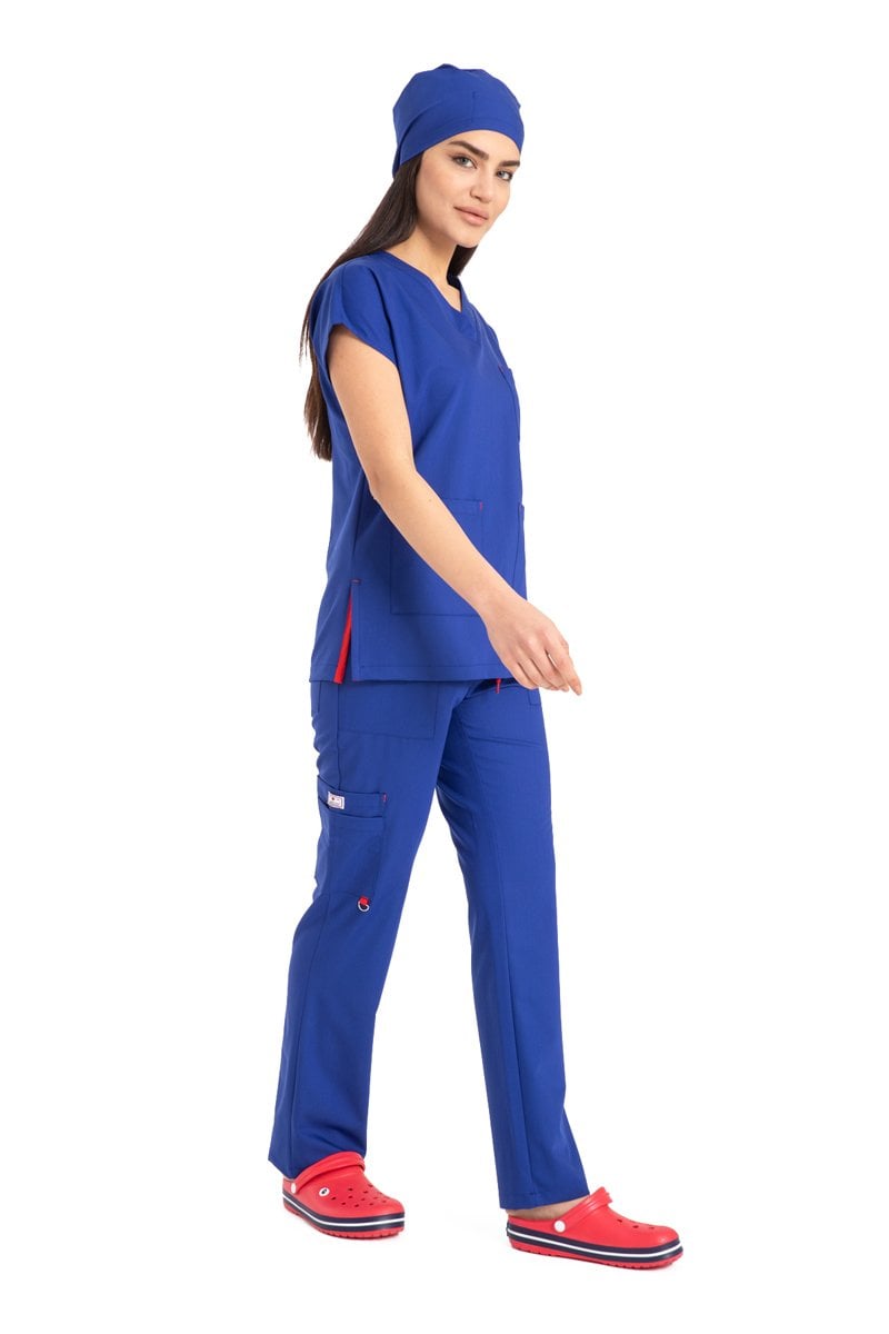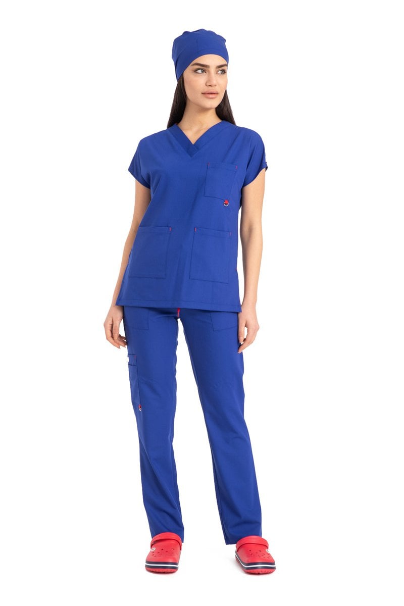 - Modern ve Şık Tasarım: Cerrahi yaka ve kısa kollu üst, lastikli paçalı pantolon ile her ortamda şık ve profesyonel görünmenizi sağlar.