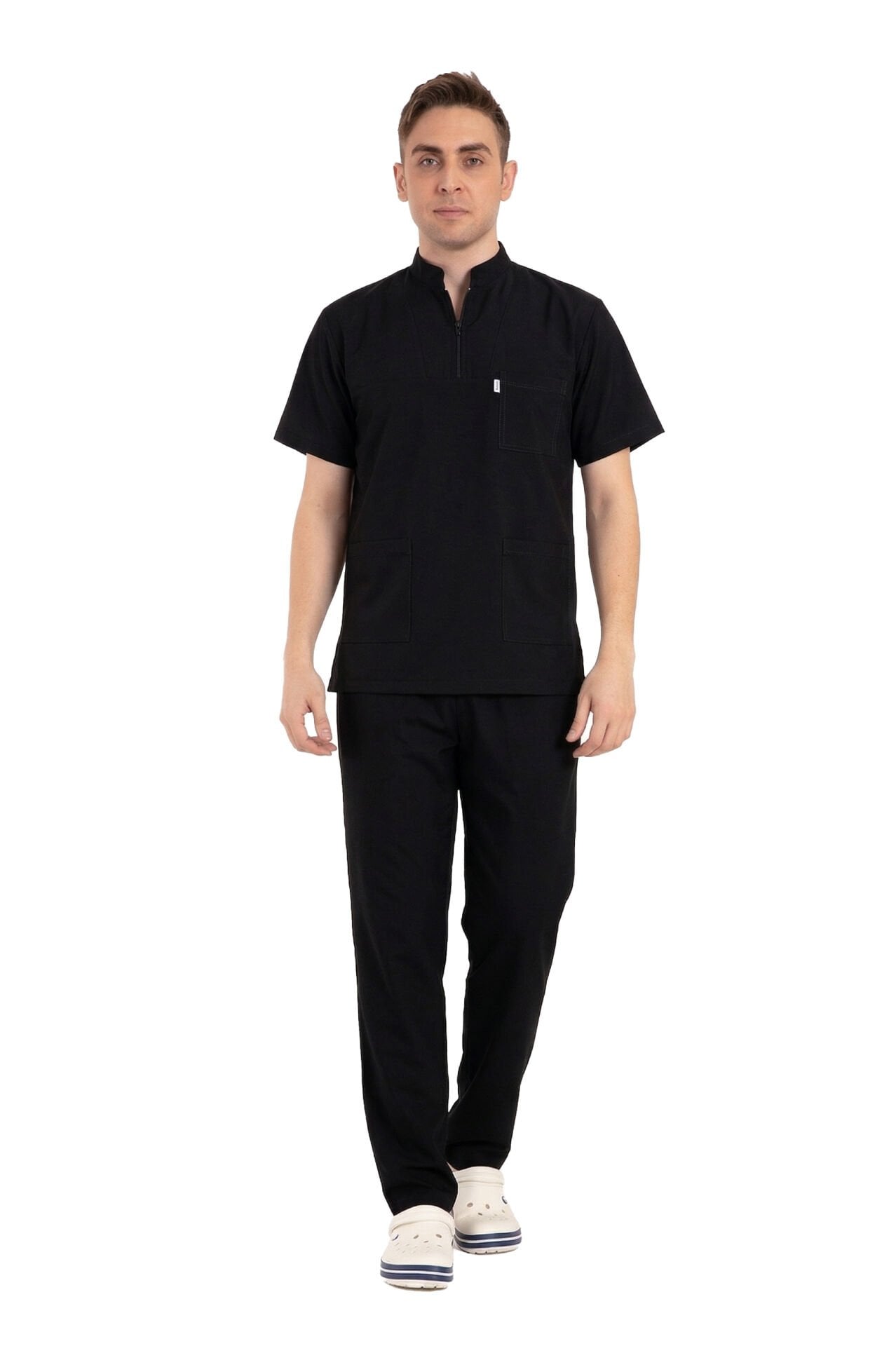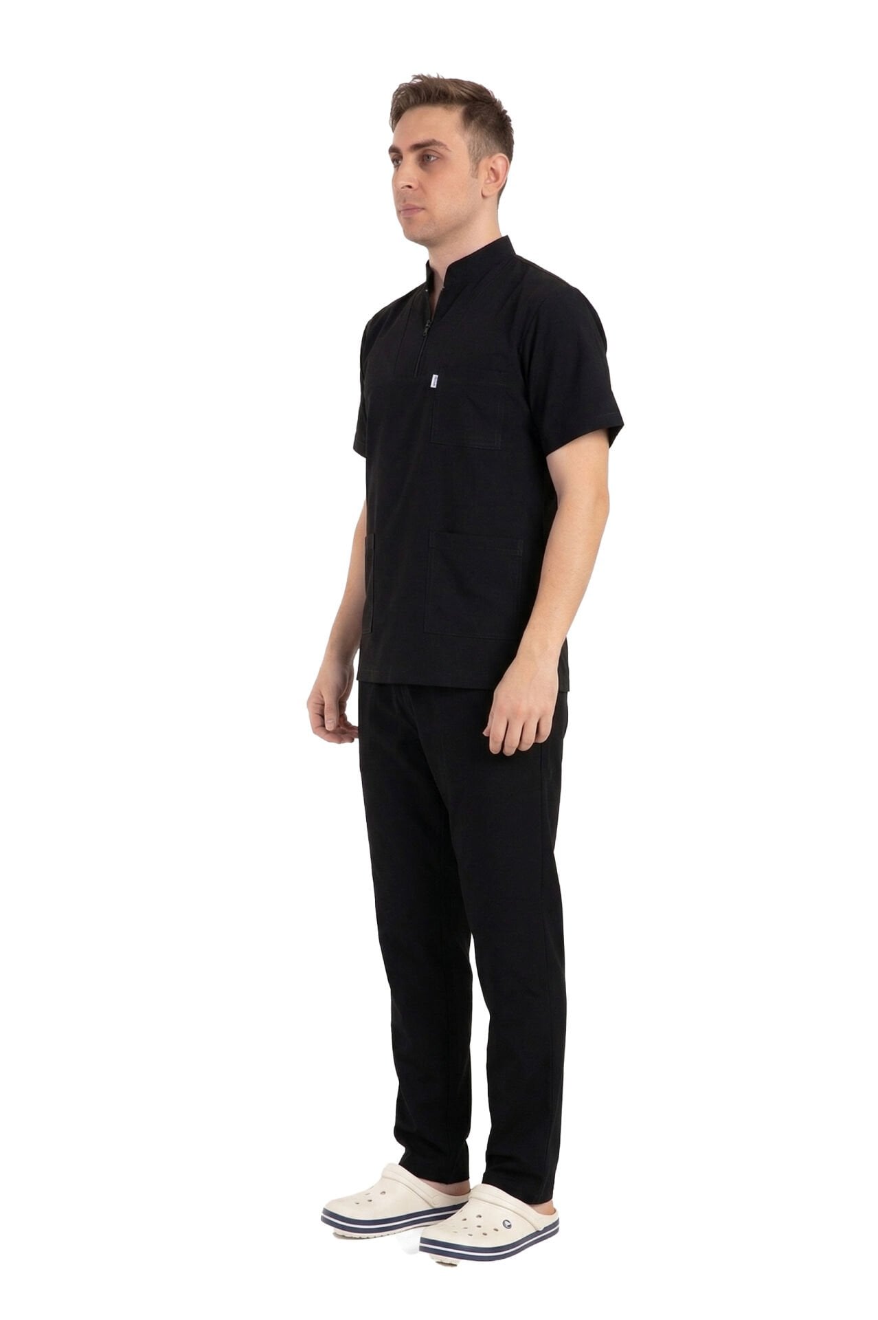 Siyah erkek sağlık personeli kıyafeti olarak öne çıkan bu model; hastane, klinik ve polikliniklerde kurumsal kimlik oluşturmak isteyen sağlık kuruluşları için de ideal bir seçimdir.