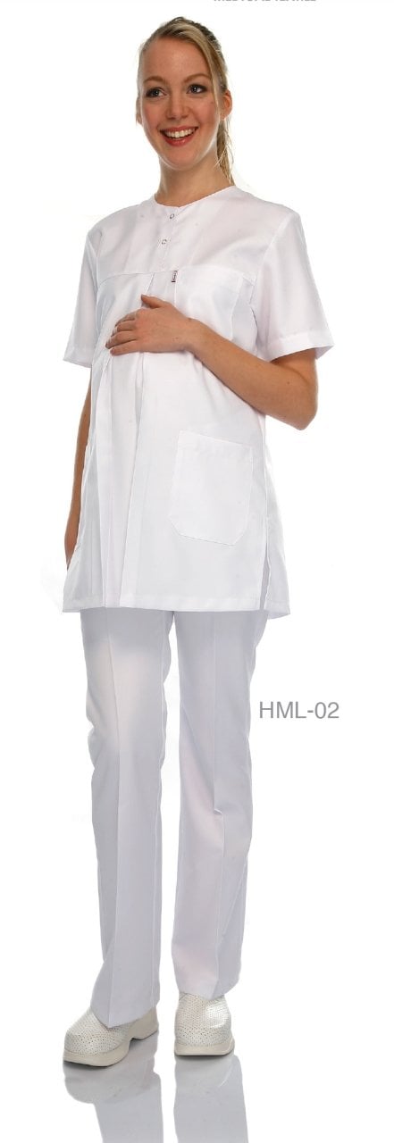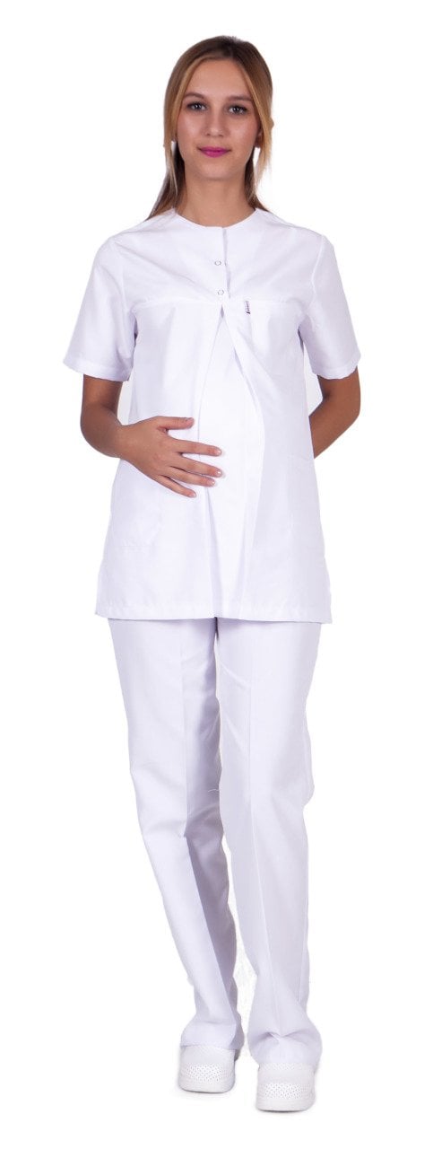 Hamile Hemşire Forması Beyaz Alpaka Kumaş Sıfır Yaka Çıtçıtlı