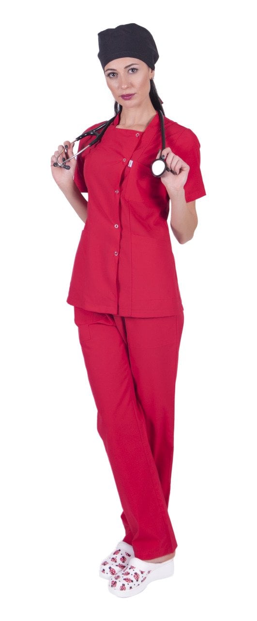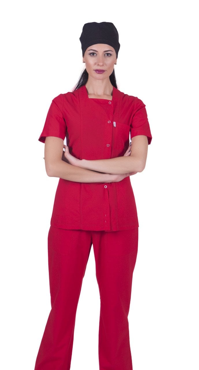 Hemşire Forması Takım-Kare Yaka Çıtçıtlı Kırmızı Alpaka Kumaş KRÇ-01