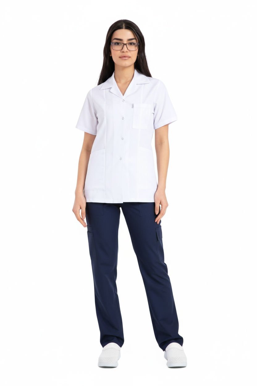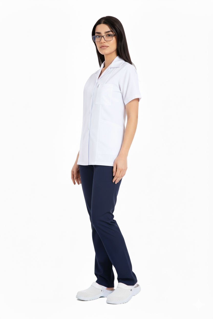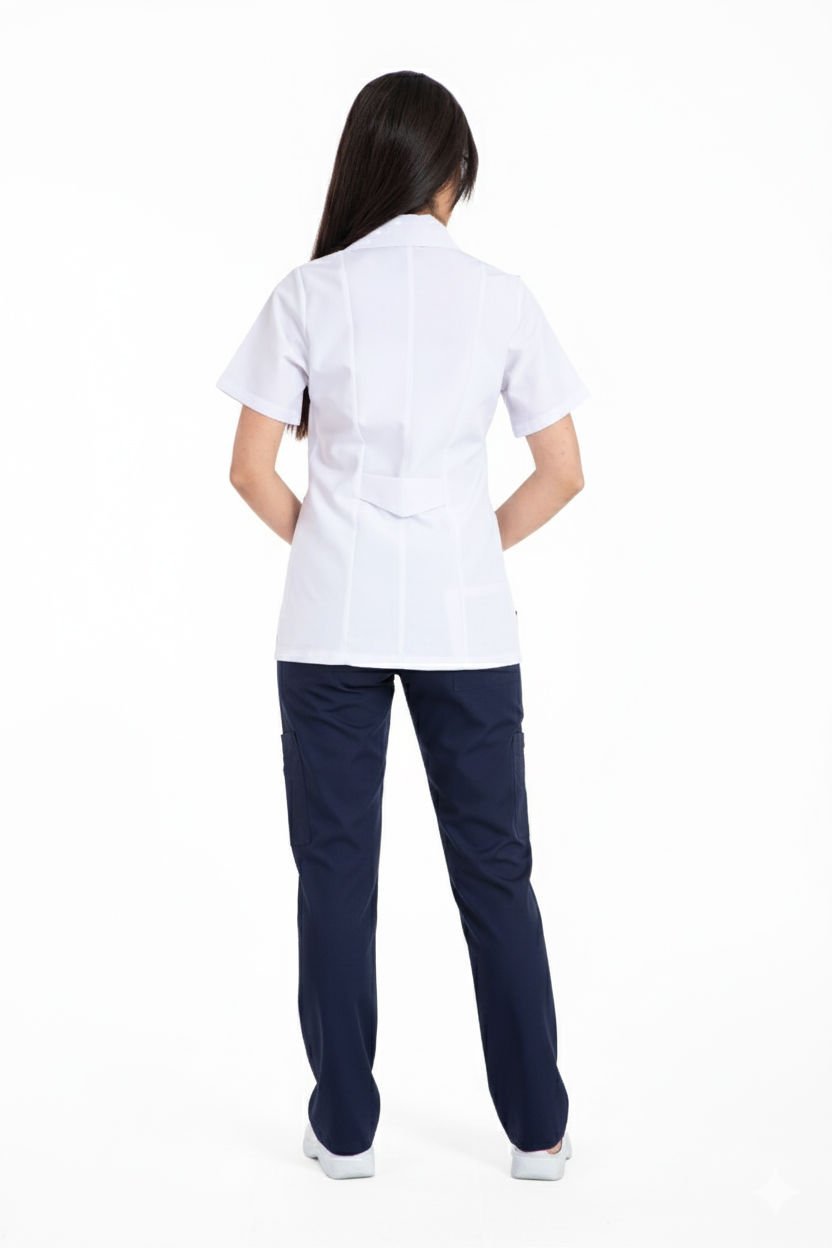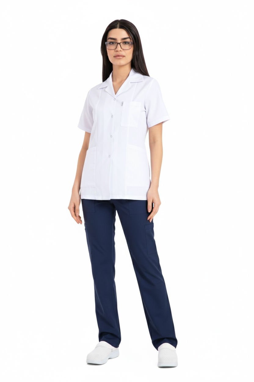 Hemşire Forması Takımı | Alpaka Kumaş | Beyaz Üst | Lacivert Alt | Ceket Yaka | Boru Paça Pantolon | BHE01