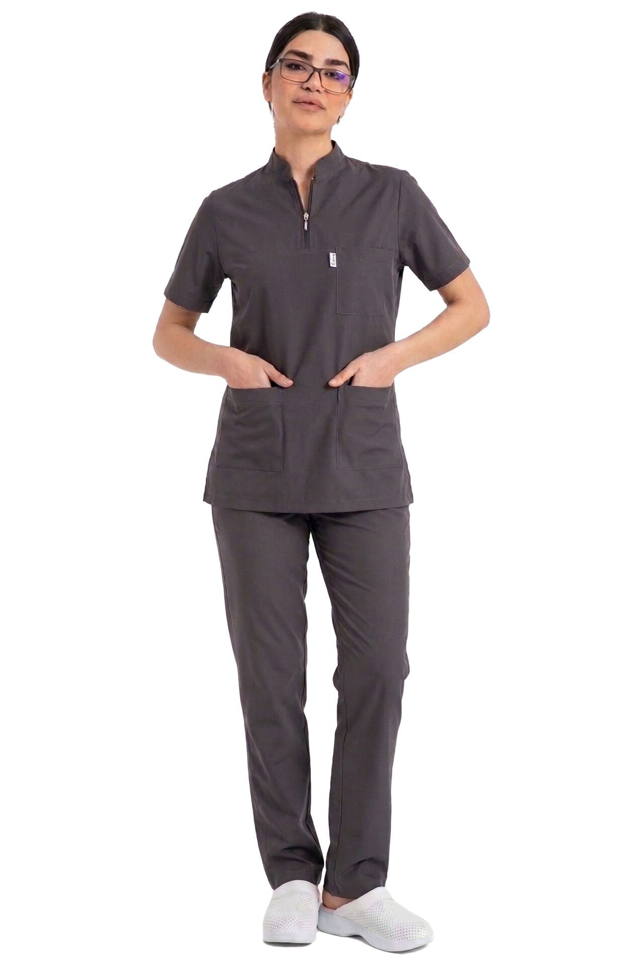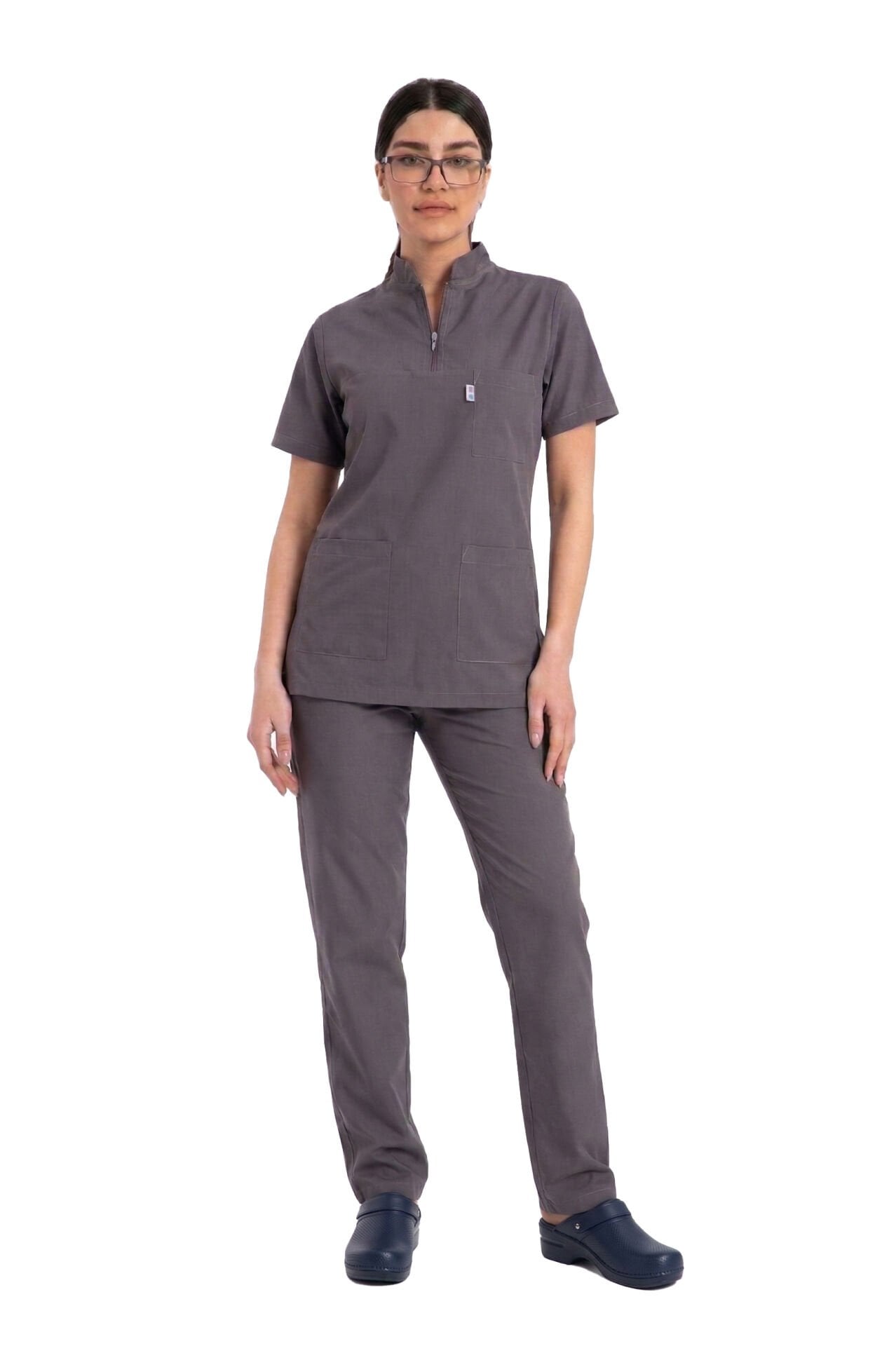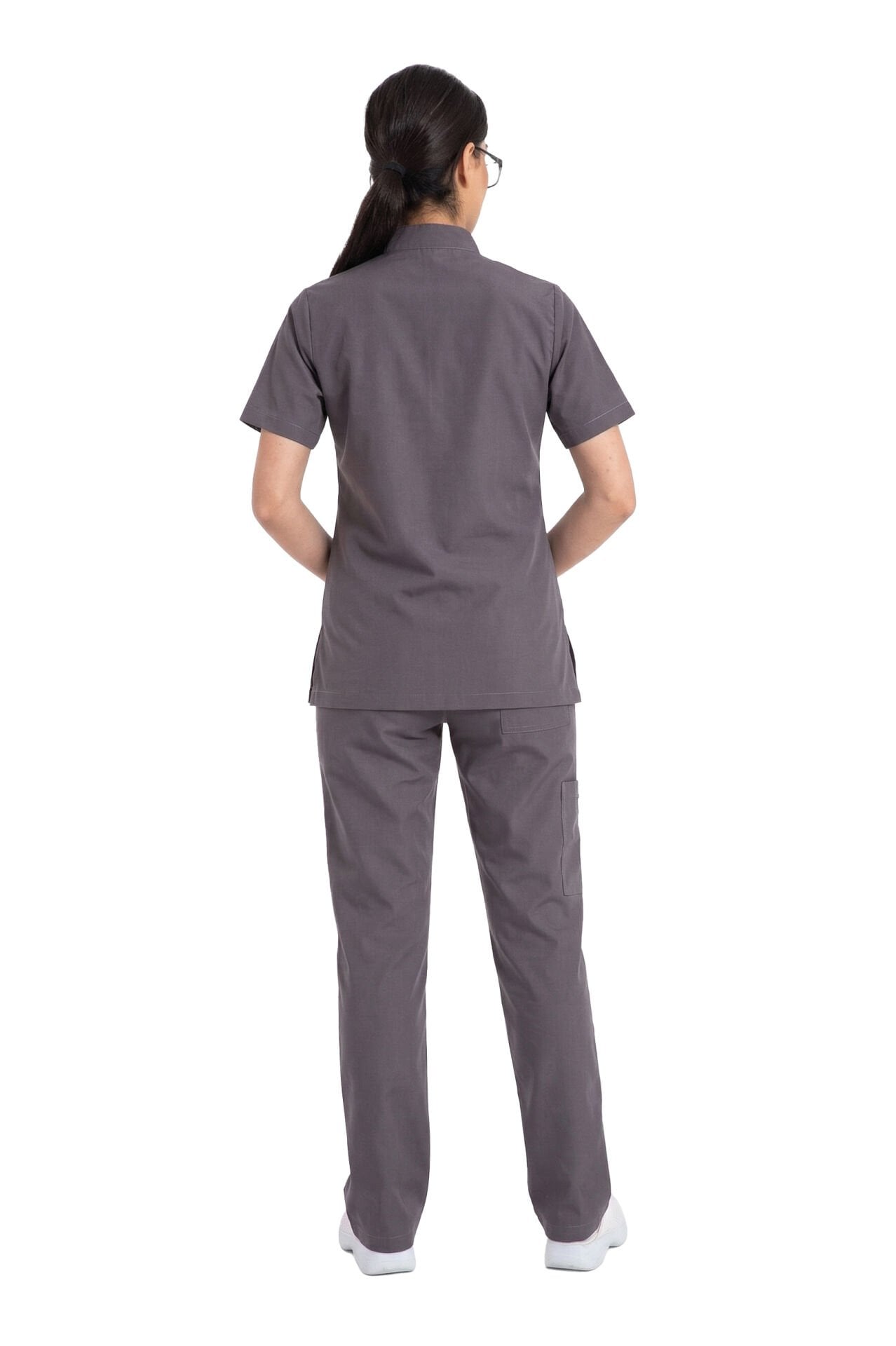 Kadın Likralı Scrubs Cerrahi Takım - Hakim Yaka Havuç Kesim İDX-1 - Füme; doktor, hemşire, eczacı, fizyoterapist, veteriner ve tüm sağlık profesyonelleri için uygundur. Aynı zamanda estetik merkezleri, diş klinikleri, spa ve güzellik salonlarında çalışan profesyoneller tarafından da tercih edilmektedir.