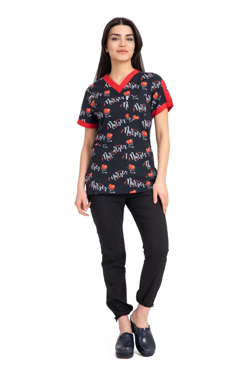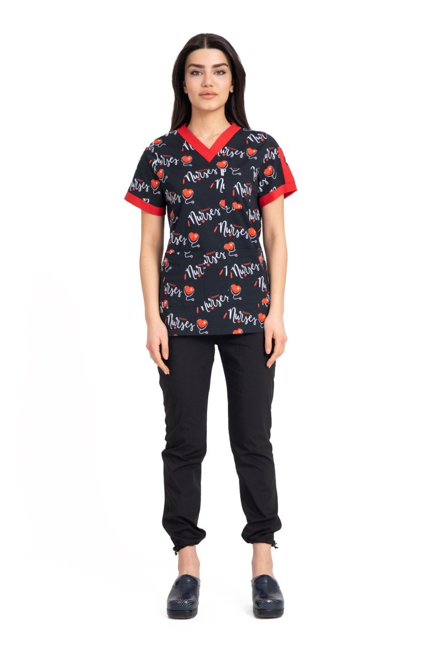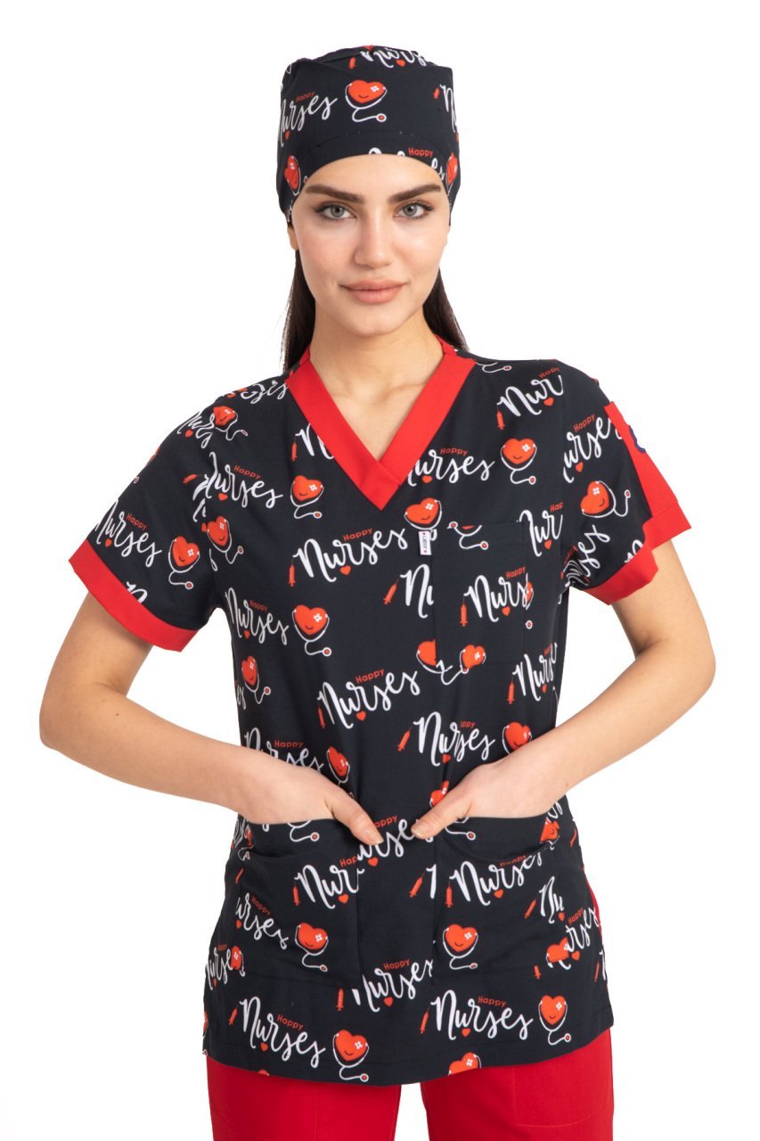 Likrali Pamuklu Kadın Desenli Cerrahi Tek Üst Forma