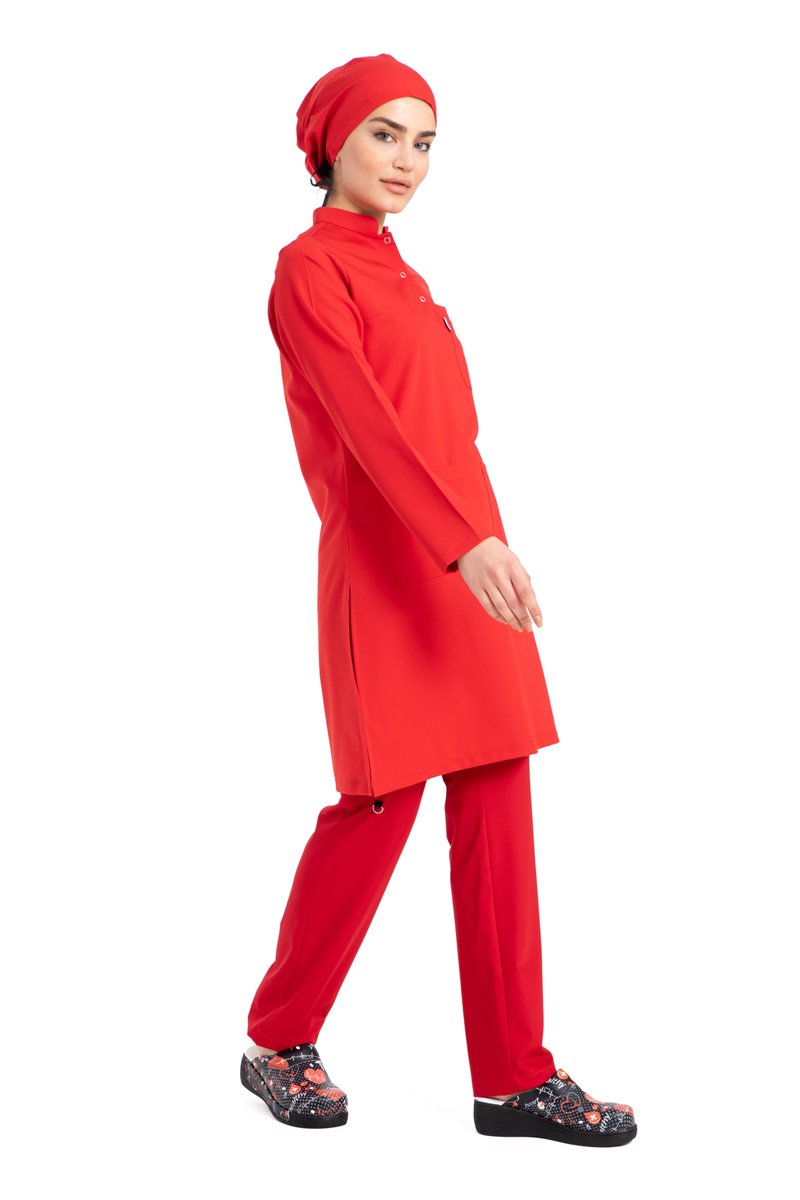 Labor Tesettür Scrubs Forma TST-03 | Elastik Likralı Pamuklu | Doktor & Hemşire 36/XS - Kırmızı