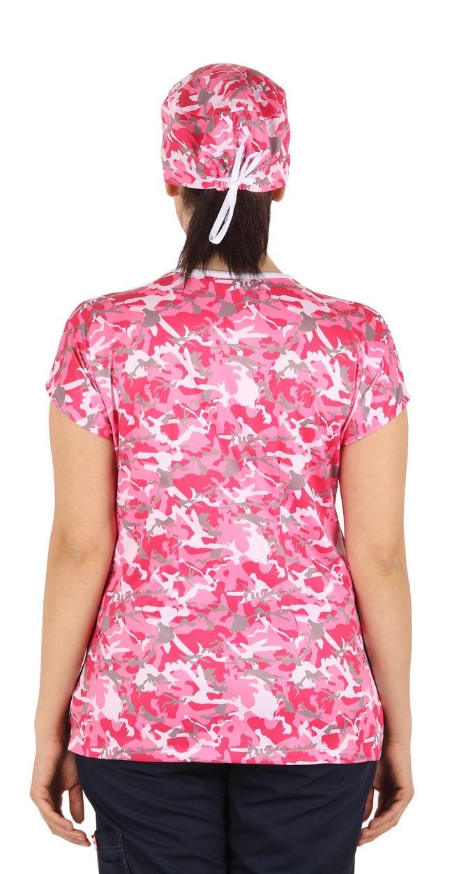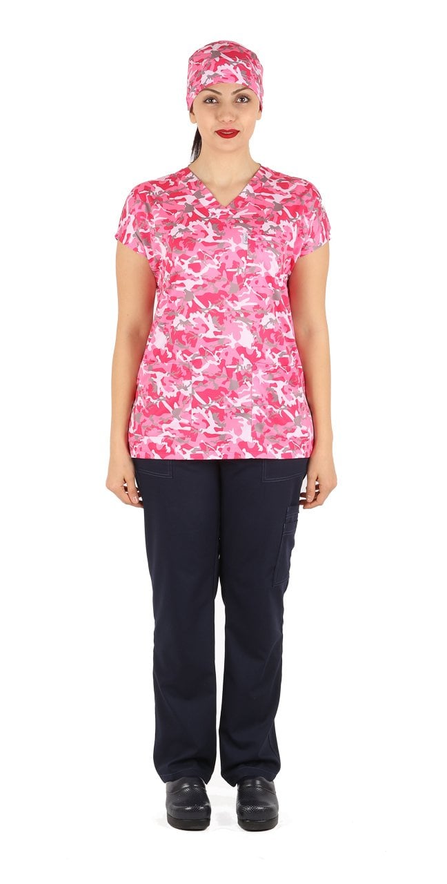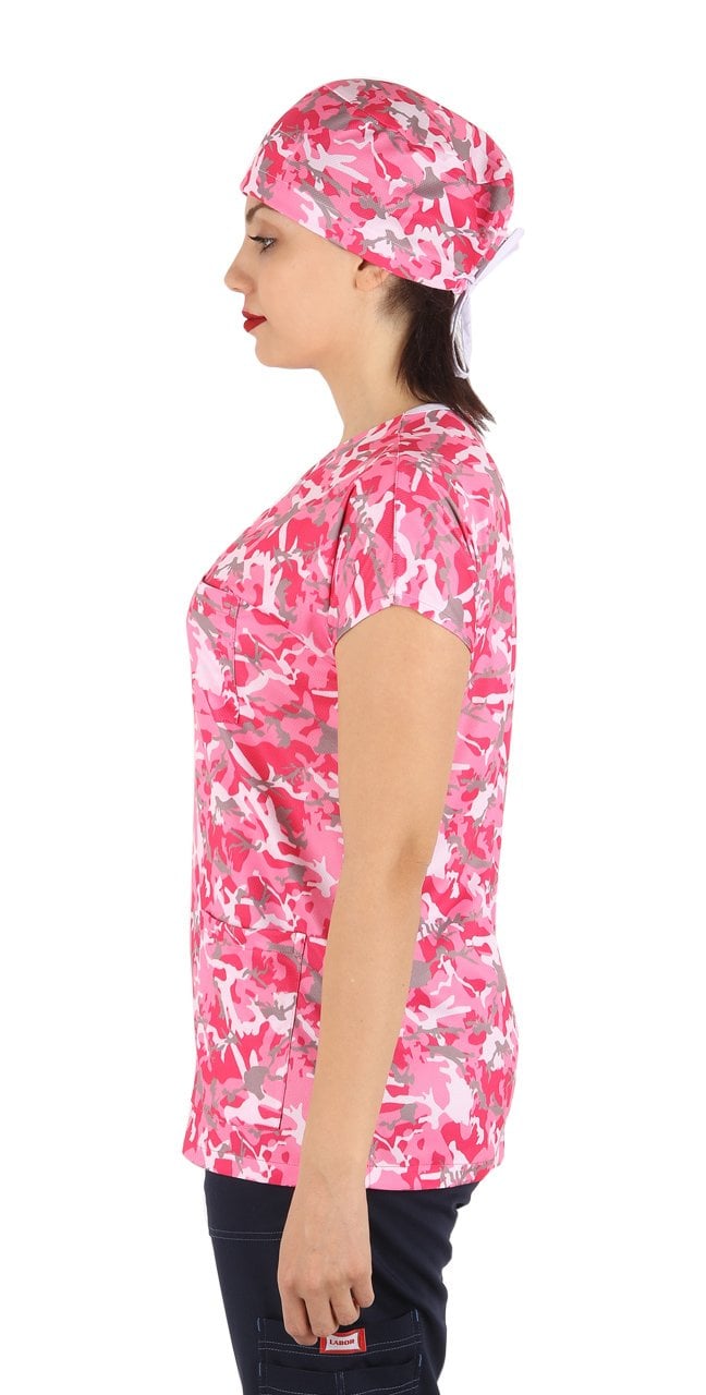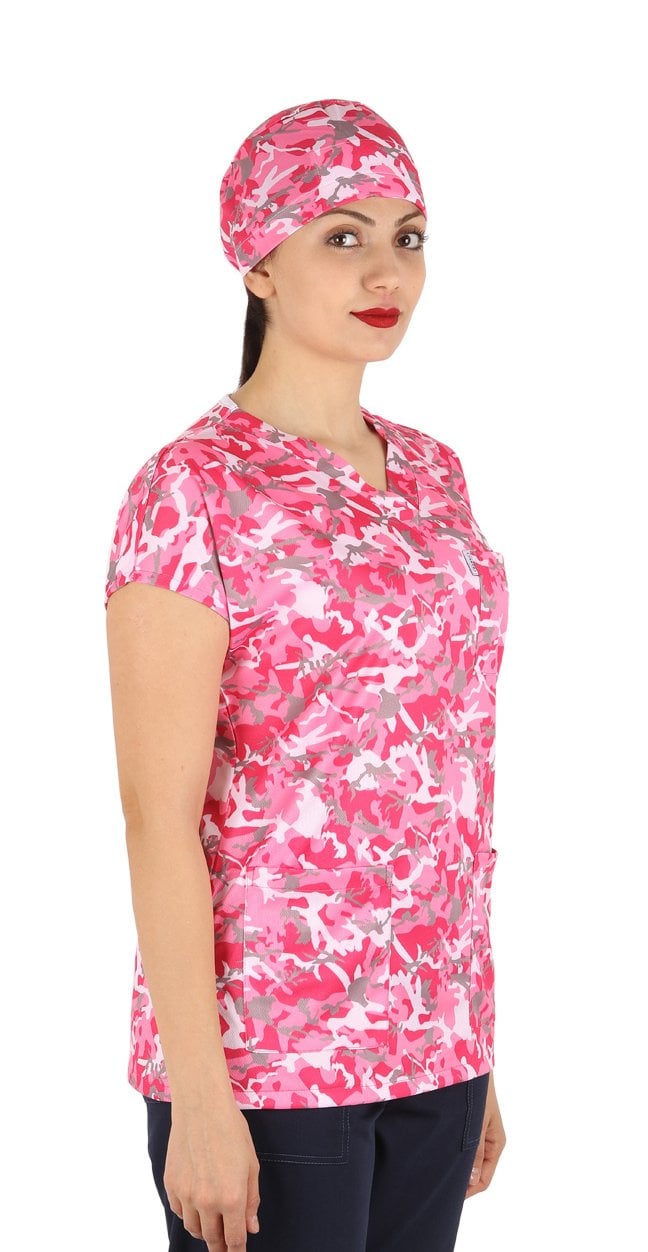 Sağlık sektöründe çalışan kadınların hem işlerini severek yapmalarını hem de şık görünmelerini sağlamak için tasarladığımız pembe kamuflaj desenli bayan üst forma, modern çizgileri ve fonksiyonel özellikleriyle dikkat çekiyor.