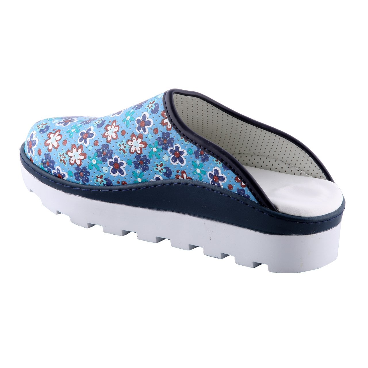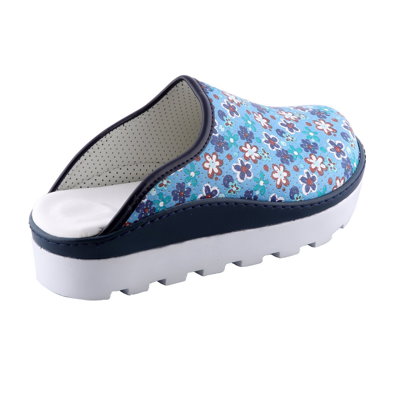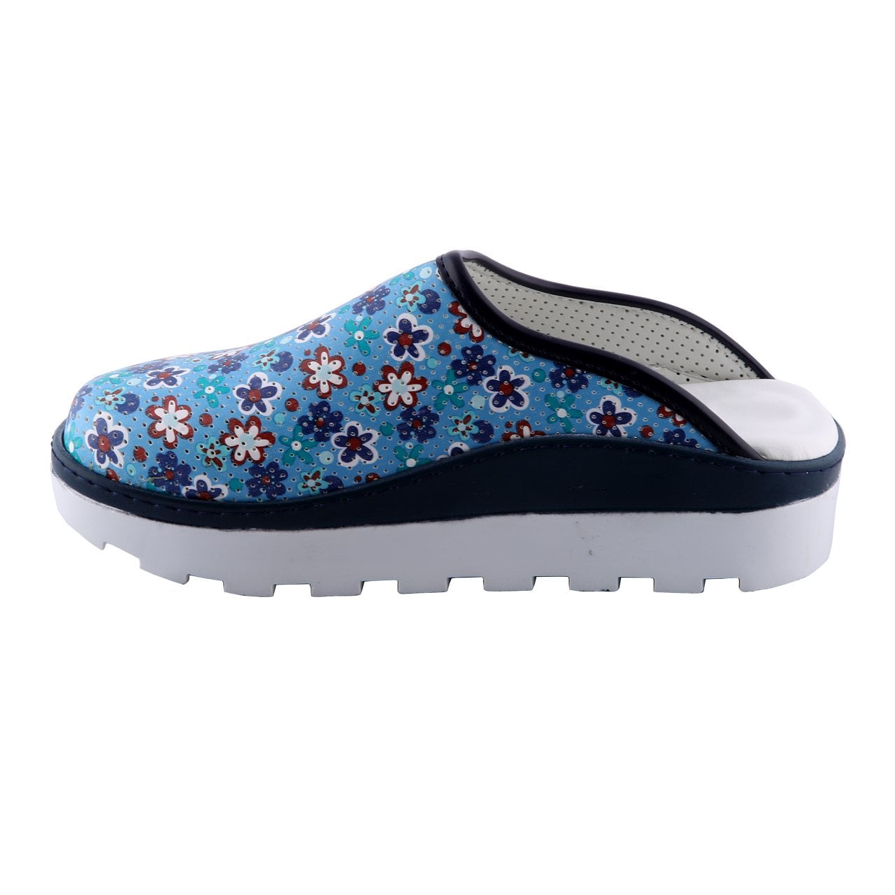 Sabo Terlik Bayan Lüx Mavi Çiçekli Ortopedik Orjinal Deri