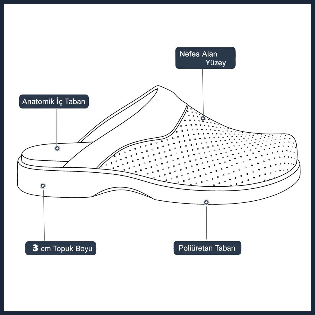 Tam ortopedik olarak hazırlanan bu ürünümüz, üzerindeki delikler sayesinde ayağınızın sürekli hava almasını bu sağlar. Ayağınızda ter koku oluşumunu engelleri. Yumuşak hafif bir nemli bezle tabanını ve üst deri kısmını silebilirsiniz. Dilerseniz derinin rengine uygun boyayla boyayabilirsiniz. Poliüretan taban sayesinde ayağınızı yormaz ayağınıza destek olarak rahat ve konforlu bir yürüyüş sağlar. Doktor sabo terliklerimiz, veteriner hekimler, aşçılar ve tam ortopedik terlik kullanmak isteyen herkes için sitemizde ve Ankara sıhhıyede bulunan mağazamızda satın alabilirsiniz.