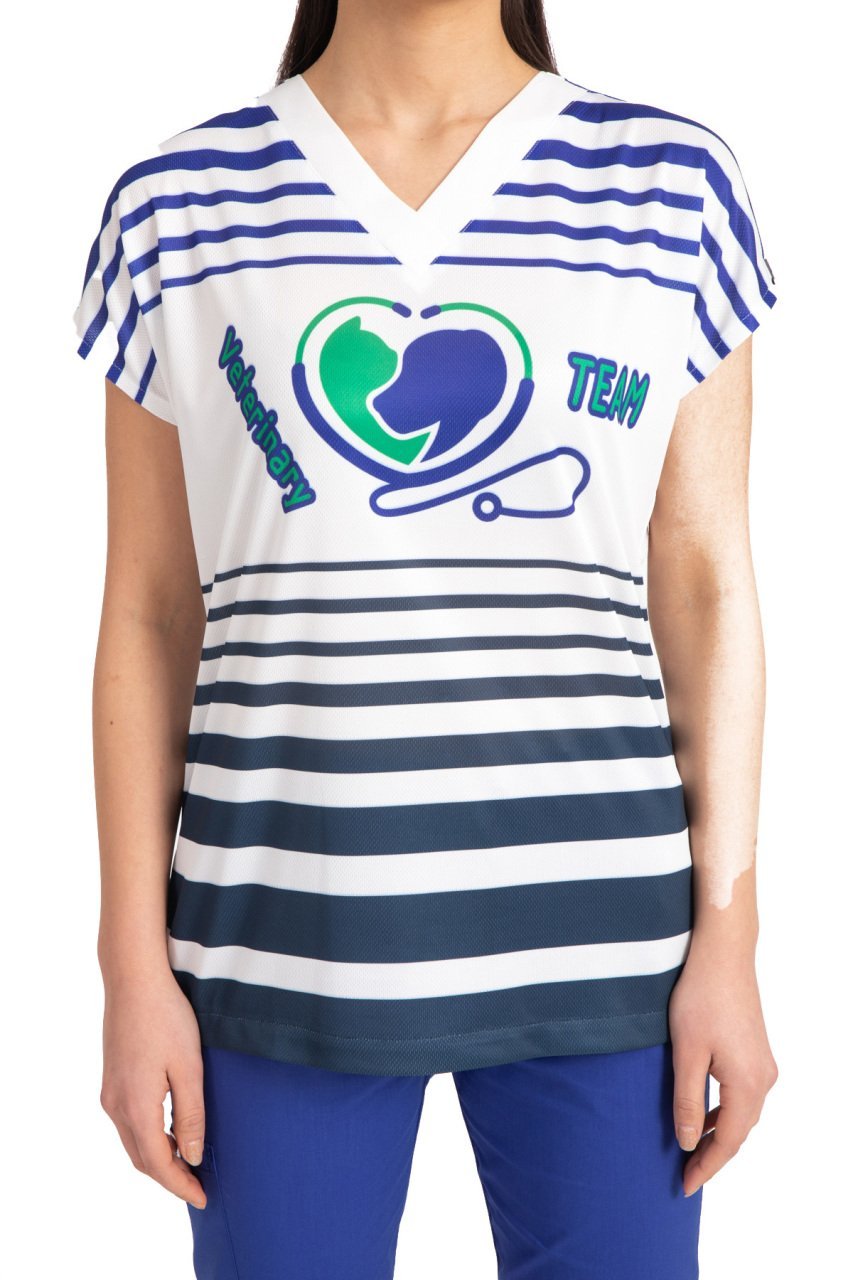 Veteriner hekim forma kadın tek üst, tek parçalı bir üstten oluşur ve genellikle kadın vücuduna uygun olarak tasarlanmıştır. Bu kıyafetler genellikle sağlık çalışanları için üretilen scrubs benzeri kumaşlardan yapılır ve özel olarak hijyenik bir yapıya sahip olması için antimikrobiyal özelliklere sahip olabilir.